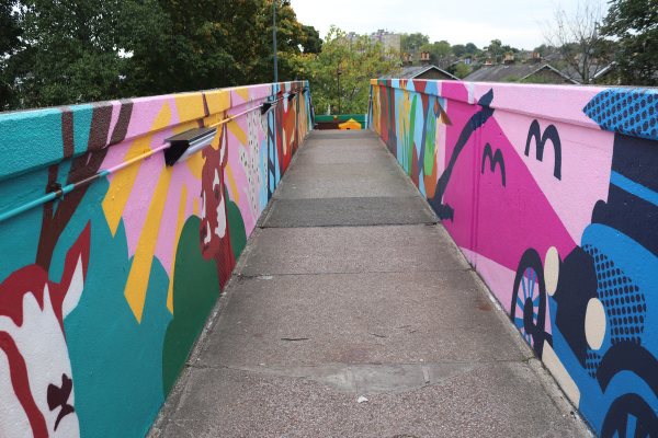 A brightly coloured mural now adorns the footbridge connecting St Mary’s Grove and Sheendale Road. It was officially unveiled by the Mayor of Richmond, Councillor Penny Frost, on 1 October.